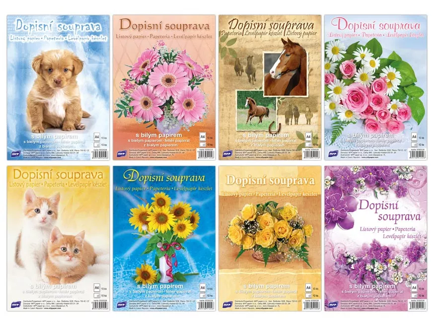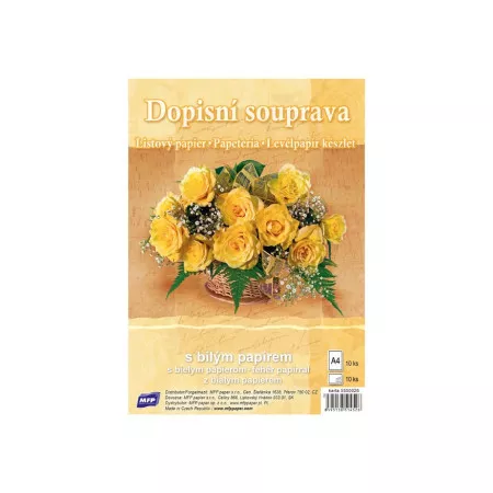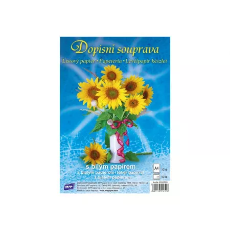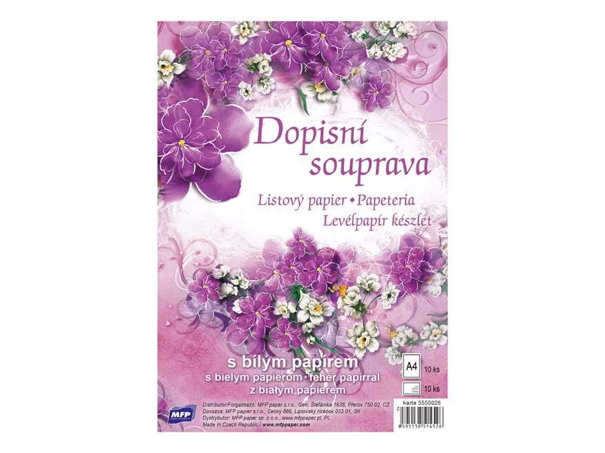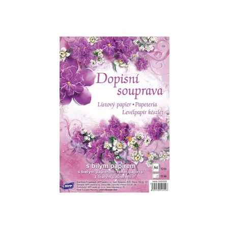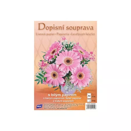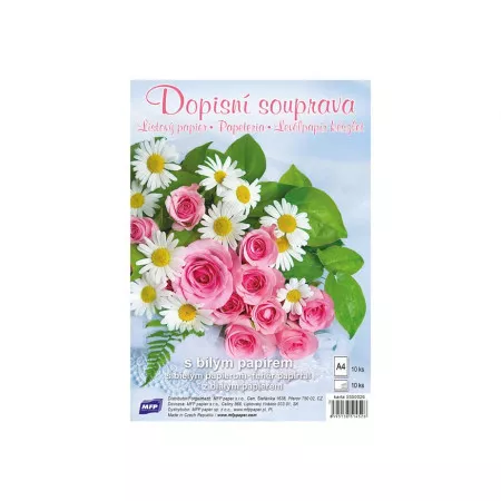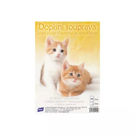 Dopisní papír MFP OB. Dopisní souprava s bílým papírem - bez linek - Sada určená pro posílání dopisů. Pořiďte si k soupravě také naše propisky, gelové pera nebo kuličková pera. BALENÍ OBSAHUJE: 10 čistých dopisních papírů a 10 bílých poštovních obálek. Formát: A4. Baleno v plastovém průhledném obalu se závěsem.