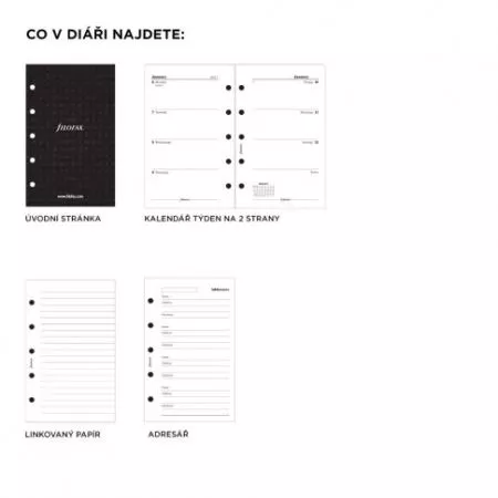 transparentní krycí stránka, úvodní stránka, kalendář týden/2 strany, 4 rozřazovače, adresář, bílé linkované papíry