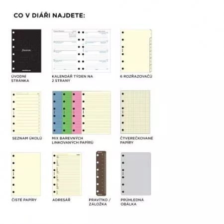 kalendář týden/2 strany ČJ a SJ, krémové rozřazovače 1–6, hnědé pravítko/záložka, seznam úkolů krémový (4 listy), krémové linkované papíry (4 listy), krémové čtverečkované papíry (4 listy), krémové čisté papíry (4 listy), modré linkované papíry (4 listy), zelené linkované papíry (4 listy), růžové linkované papíry (4 listy), krémový adresář (6 listů), průhledná obálka
