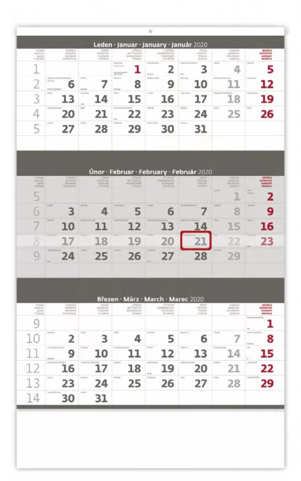 Kalendář 2020 HELMA 365 Tříměsíční šedý N204-20, Formát: 315x450mm, prostor pro přítisk: 315x70mm, kalendárium: české tříměsíční se svátky vybraných evropských států, vazba: twin wire s očkem