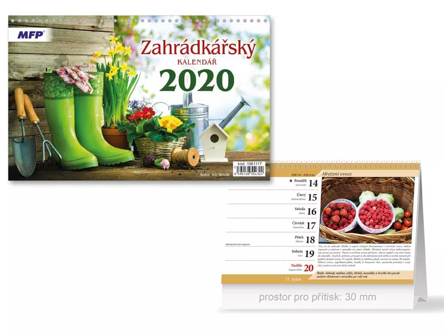 Stolní kalendář MFP na rok 2020 s názvem Zahrádkářský, vhodný pro milovníky zahradničení. Najdete zde fotky nejrůznějšího ovoce, zeleniny a plodů, které vypěstovali naši zahradníci. Pod každou fotkou je popis plodu a také nejrůznější vzácné rady pro konzumaci nebo péči o ně. Možnost dotisku firemního loga a textu na spodní stranu kalendáře.