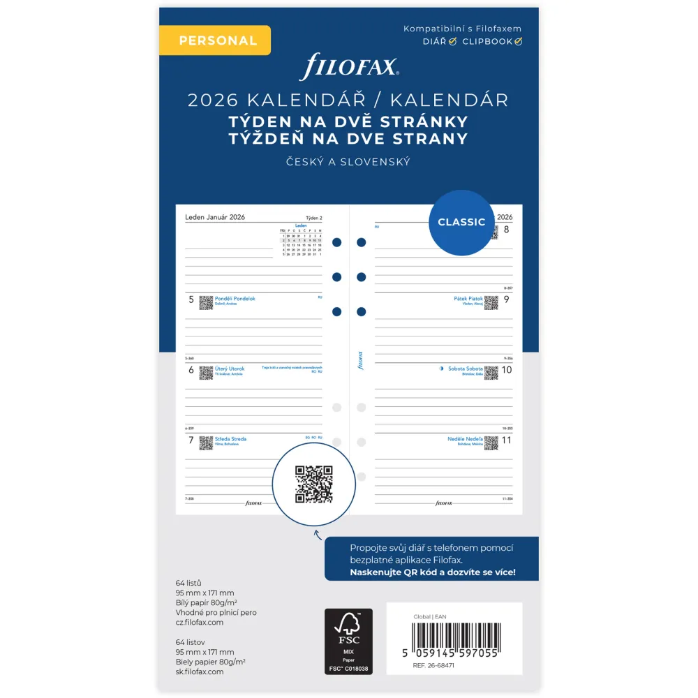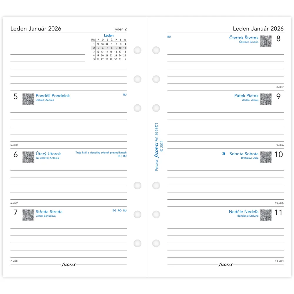 Filofax, kalendář 2026 osobní, týden/2 str, linky, ČJ+SJ