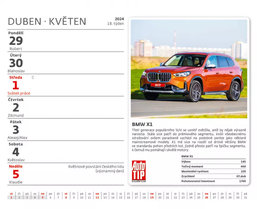 Kalendář Auta (SM11-24). Formát kalendáře: 17,1 x 13,9 cm. Kalendárium: české týdenní řádkové.