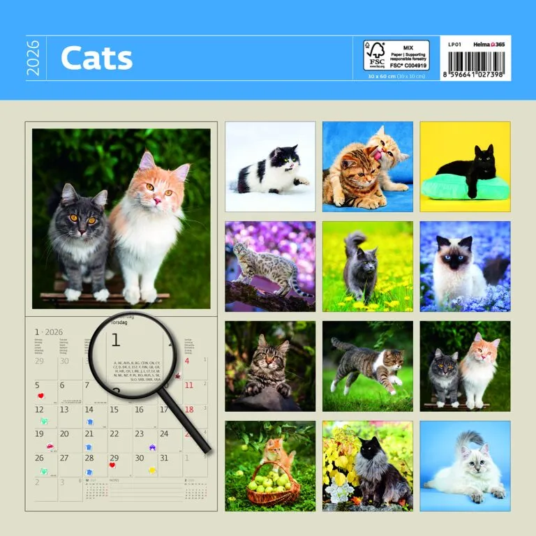 Nástěnný kalendář Cats (LP01-26). Formát kalendáře: 30 x 30 cm (30 x 60 cm) 14 listů + samolepky 12 fotografií s měsíčním kalendáriem Kalendárium: měsíční mezinárodní se svátky 40 států Kalendárium v šesti jazycích (GB, D, F, I, NL, DK) Vazba: Twin-wire (se spirálou) Super tuhá lepenka Více než 300 barevných ...
