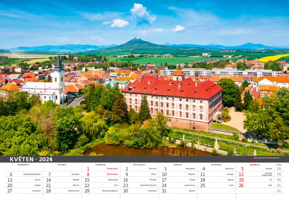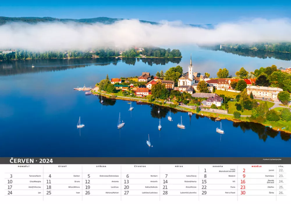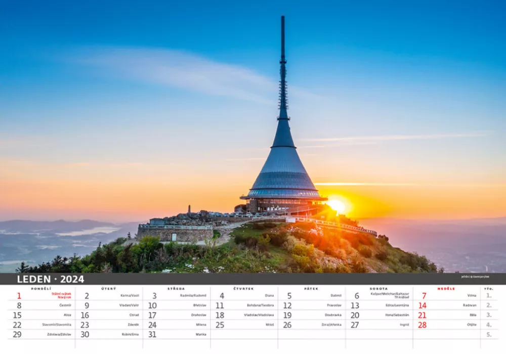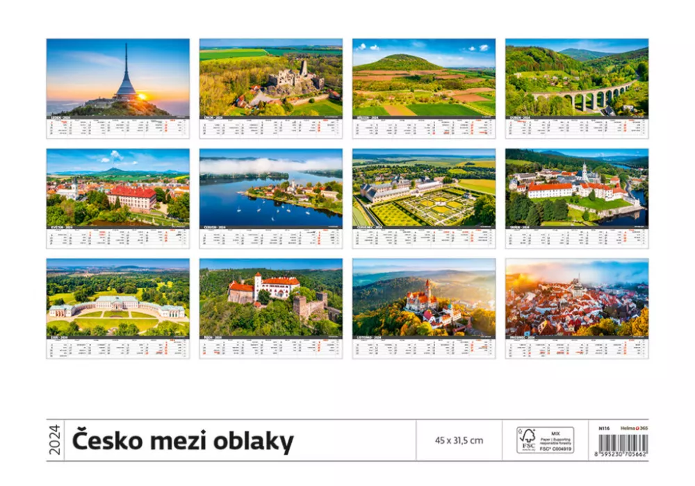 Kalendář Česko mezi oblaky (N116-24). Formát kalendáře: 45 x 31,5 cm. Kalendárium: české měsíční jmenné. Rozsah kalendáře: 14 listů.
