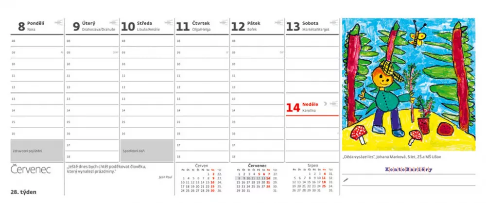 Plánovací kalendář Děti malují pro Konto Bariéry Finanční prostředky získané prodejem stolních kalendářů pro Konto Bariéry jsou poskytnuty Fondu vzdělání, který pomáhá hradit přímé náklady na studia zdravotně postiženým dětem a mládeži v síti základních a speciálních škol.I MALÝ PŘÍSPĚVEK MÁ SMYSL Všechny možnosti dárcovství naleznete na této adrese: