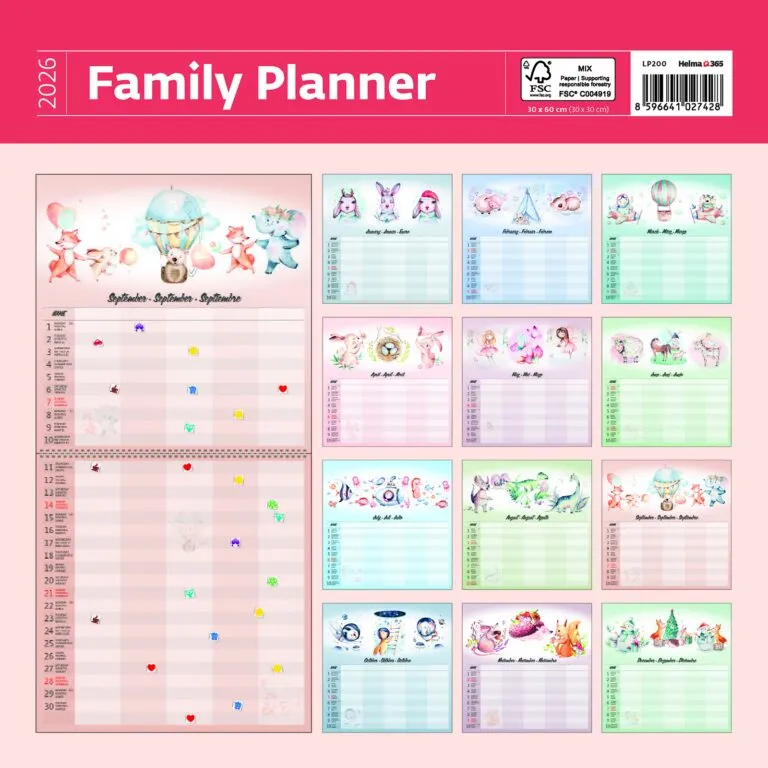 Nástěnný kalendář Family Planner (LP200-26). Formát kalendáře: 30 x 30 cm (30 x 60 cm) 14 listů + samolepky 12 fotografií s měsíčním kalendáriem Kalendárium: měsíční mezinárodní se svátky 40 států Kalendárium v šesti jazycích (GB, D, F, I, NL, DK) Vazba: Twin-wire (se spirálou) Super tuhá lepenka Více než 300 ...