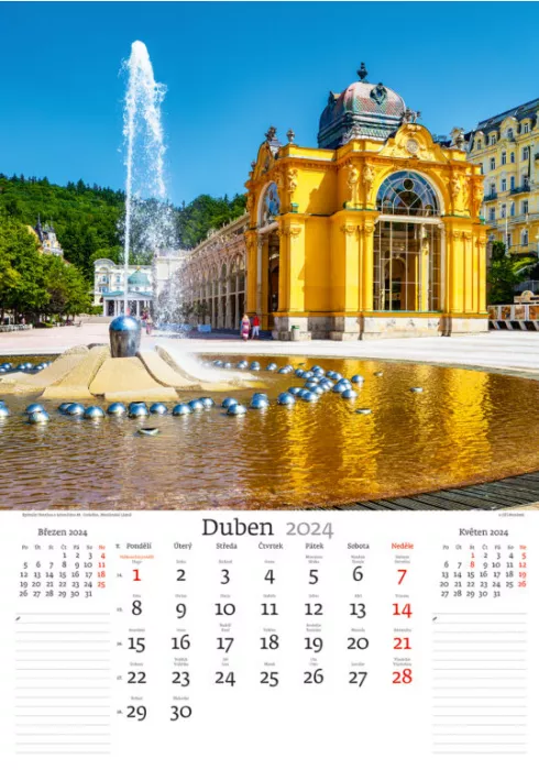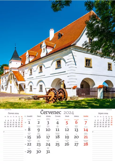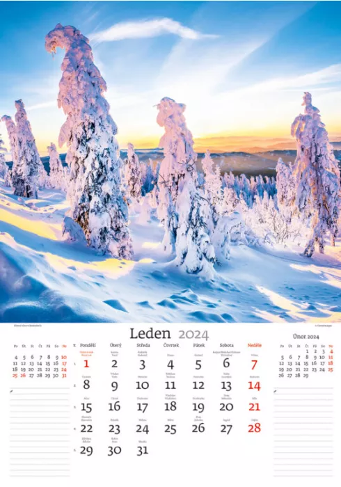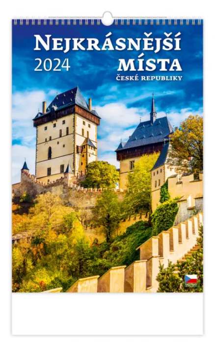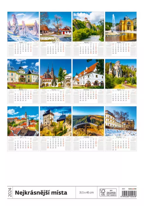 Kalendář Nejkrásnější místa ČR (N111-24). Formát kalendáře: 31,5 x 45 cm. Kalendárium: české tříměsíční jmenné. Rozsah kalendáře: 14 listů.