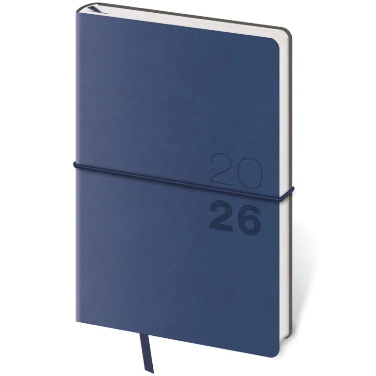 Moderní diář v měkké ohebné vazbě s kulatou příčnou gumičkou přes hřbet představuje nejnovější způsob zpracování. Diář je příjemný do ruky díky matné kožence a lehký díky měkkým deskám. Materiál desek se hodí na sleporažbu, která na kožence vynikne.