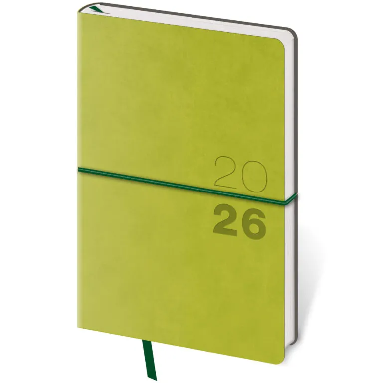 Moderní diář v měkké ohebné vazbě s kulatou příčnou gumičkou přes hřbet představuje nejnovější způsob zpracování. Diář je příjemný do ruky díky matné kožence a lehký díky měkkým deskám. Materiál desek se hodí na sleporažbu, která na kožence vynikne.