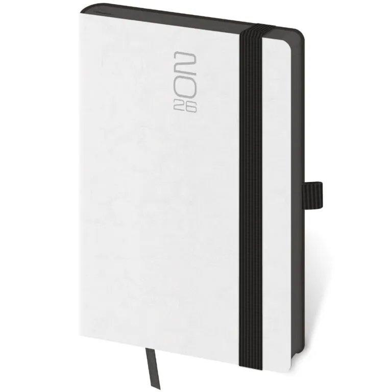 K nerozeznání od skutečné kůže, navíc doplněn gumičkou přes hřbet a ořízkou bloku v černé barvě. Dalšími doplňky je papírová kapsa na vnitřní straně zadních desek a poutko na tužku.