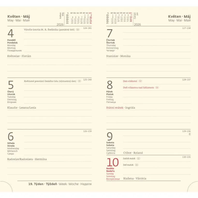 Diář obsahuje: osobní údaje, plánovač dovolené (měsíční přehled), plánovací kalendář, mezinárodní svátky, roční výhled, týdenní layout, adresář
