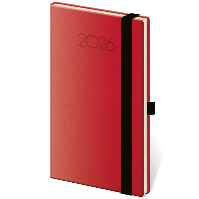 Diář je vyroben ze zajímavé matné koženky s nepravidelnou strukturou, navíc je doplněn o gumičku pro uzavření v kontrastní barvě. Vzhledem ke struktuře materiálu je vhodná pro sleporažbu bez fólie, nedoporučujeme však razit drobné texty, které mohou při ražbě zaniknout.