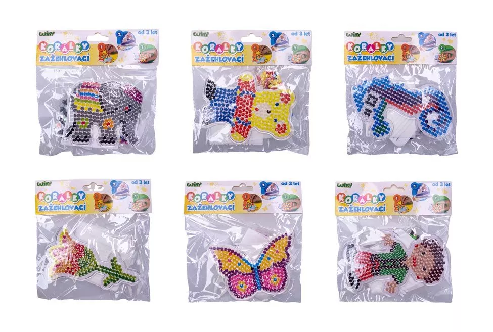 Korálky zažehlovací set WIKY mix motivů W019866. Děti a dospělí mohou strávit příjemný čas hrou s malými plastovými korálky, které navlékají, spojují nebo je zažehlují, podle předlohy, vlastní fantazie nebo využitím inspirativních předloh. Zažehlovací korálky set - MIX 6 různých vzorů - motýl, medvěd, slon, ...