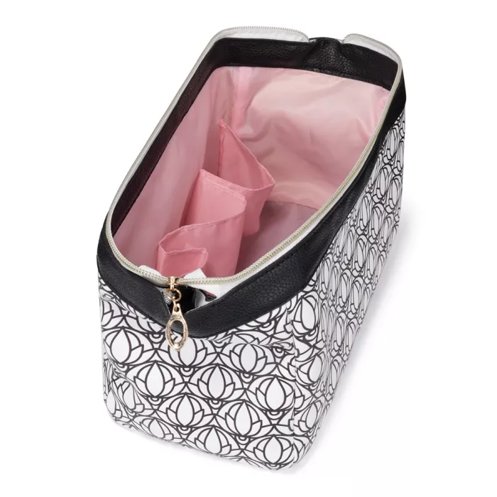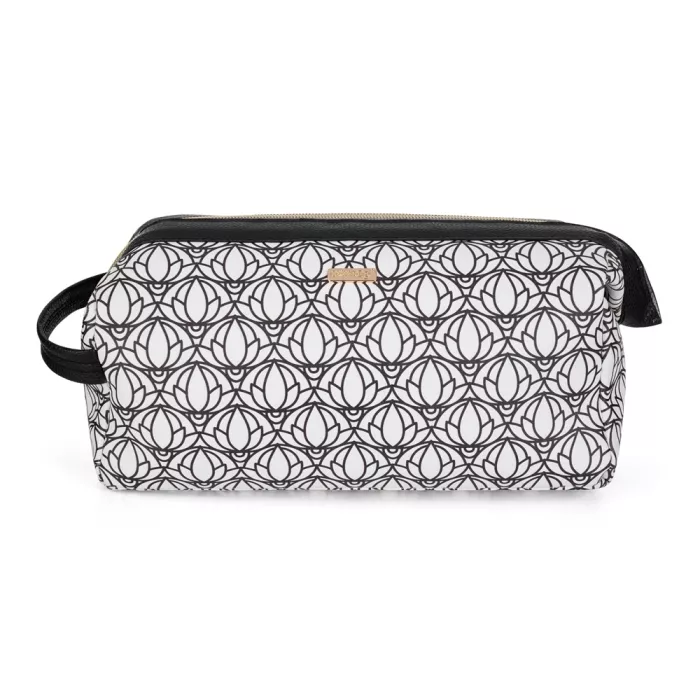 Větší cestovní kosmetická taška v černobílém provedení. Vhodná k uskladnění toaletních a kosmetických potřeb.