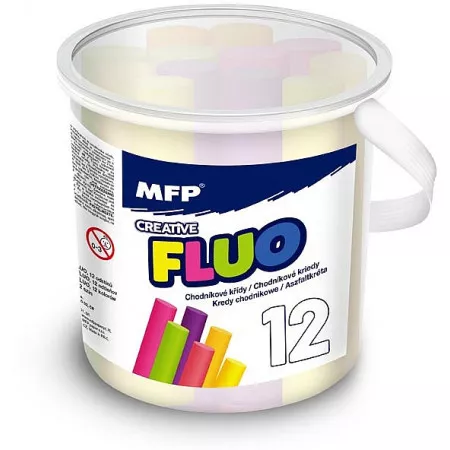 Křídy MFP M chodníkové fluo kulaté 12ks mix barev - kyblík. Chodníkové neonové křídy - různé barvy - ideální pro venkovní aktivity ve volném čase. Křídy jsou dobře umyvatelné vodou. Tyto křídy jsou určeny pro výtvarné a umělecké účely. BALENÍ OBSAHUJE: 2 ks žluté křídy 2 ks zelené křídy 4 ks oranžové křídy 2 ks růžové křídy 2 ks fialové křídy Uvedená cena je za 1 balení, ve kterém se nachází 12 barevných kříd. Křídy jsou uloženy v plastovém kyblíku.