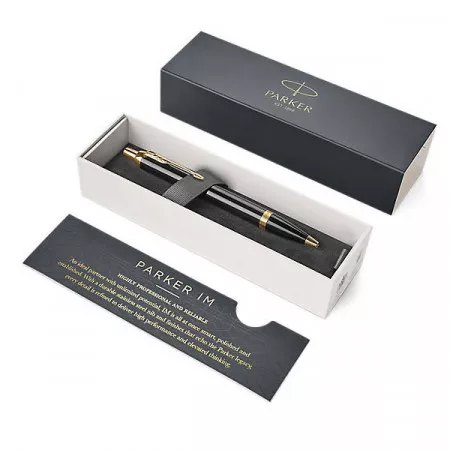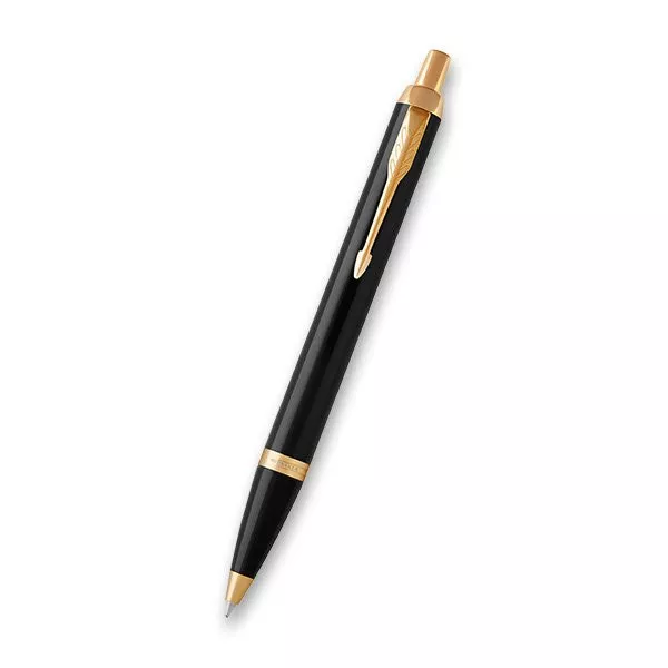 Kuličková tužka Parker IM Black GT. Mosazné tělo s lesklou lakovanou povrchovou úpravou. V kombinaci s doplňky pokovenými zlatem, s leštěnou úpravou.