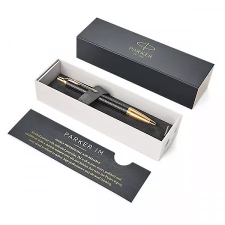 Kuličková tužka Parker IM Premium Black GT. Tělo z eloxovaného hliníku se zdobnou rytinou vytvořenou pomocí laseru, povrch ošetřen pískováním. V kombinaci s doplňky pokovenými zlatem, s leštěnou úpravou.