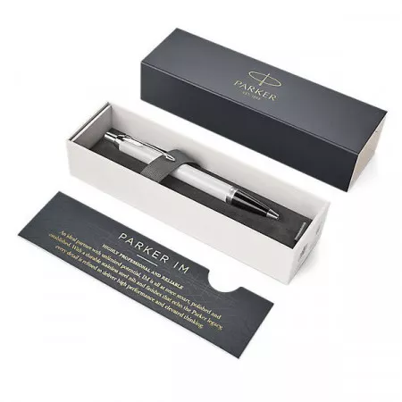 Kuličková tužka Parker IM White CT. Mosazné tělo s lesklou lakovanou povrchovou úpravou. V kombinaci s doplňky pokovenými chromem, s leštěnou úpravou.