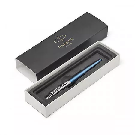 Kuličková tužka Parker Jotter Waterloo Blue CT. Lakované tělo z broušené oceli a vrchní část z broušené nerezové oceli. V kombinaci s doplňky z nerezové oceli pokovenými chromem, s leštěnou úpravou.