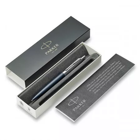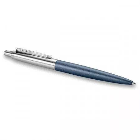 Kuličková tužka Parker Jotter XL Primrose Matte Blue. Matně modré lakované tělo z broušené nerezové oceli a vrchní část z broušené nerezové oceli. V kombinaci s doplňky pokovenými chromem.