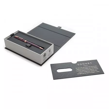 Kuličková tužka Parker Sonnet Purple Chiselled PGT. Tělo z mincovního stříbra (ryzost Ag 925/1000) pokryté perleťově fialovým lakem, zdobný vzor vytvořený leptáním. V kombinaci s doplňky pokovenými růžovým zlatem.