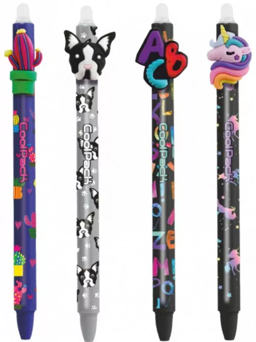 Praktické gumovací kuličkové pero pro školáky - psaní textu bez přepisování. Stačí vygumovat napsaný text a snadno napsat nový. Motivy v barevném mixu.