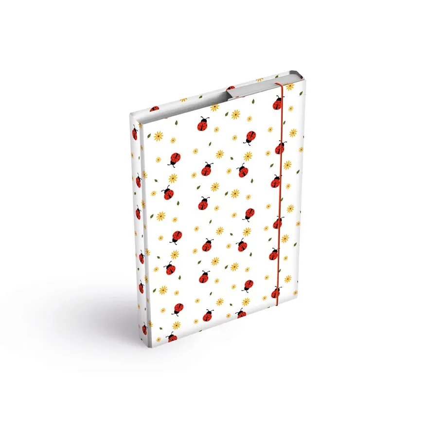 Konec pomačkaným sešitům! Rozverné berušky s květinami na školních deskách, které pojmou formát A4, ochrání školní pomůcky před ohnutými rohy i nečistotami. Odolný karton potažený laminem zvládne každodenní školní nasazení a pružná gumička udrží vše bezpečně uvnitř.