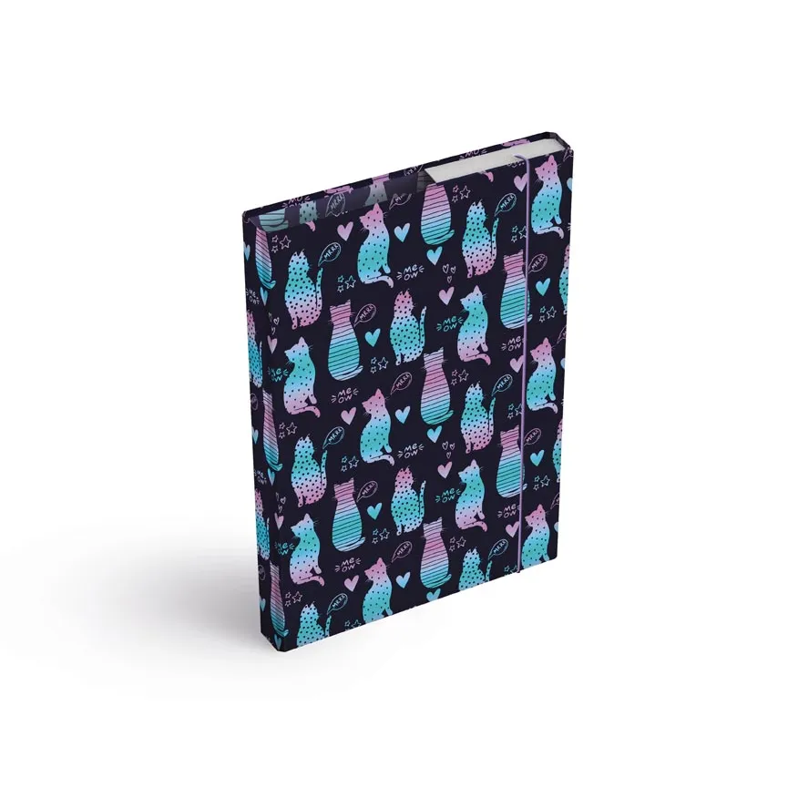 Nechte nudu za sebou a dodejte svým školním pomůckám šmrnc! Tyhle desky ve formátu A4 s hravým kočičím motivem nejen skvěle vypadají, ale také ochrání vaše sešity před ohnutými rohy a nepořádkem v batohu. Díky odolnému lepenkovému kartonu potaženému laminem zvládnou každodenní používání, zatímco pružná gumička udrží vše bezpečně na svém místě.
