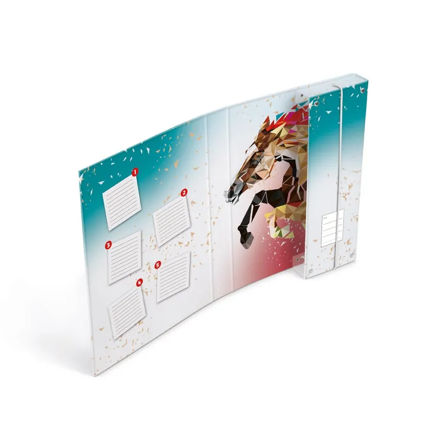 i spolehlivou ochranu školních pomůcek. Design koně složeného z geometrických tvarů v kombinaci s praktickým formátem A5 skvěle