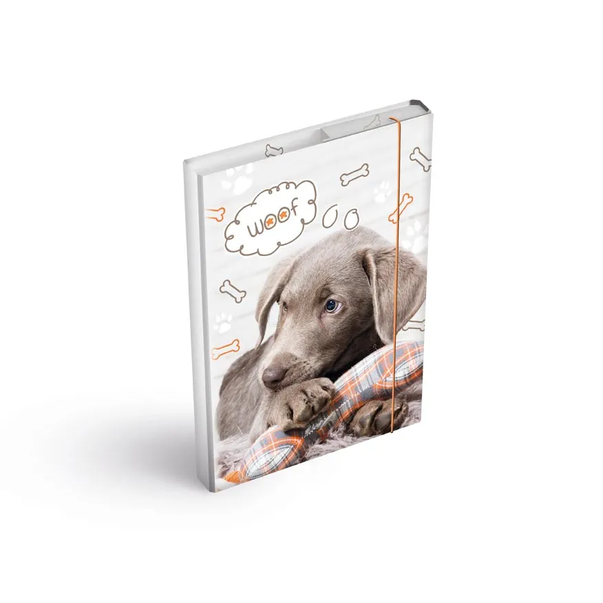 Školní desky na sešity ve velikosti A5 s motivem psa. Nezbytná součást vybavení každého školáka. Díky školním deskám budou všechny sešity a učebnice pohromadě a neponičené. Tyto desky na sešity jsou opatřeny gumou, která zabraňuje samovolnému otevření. Heft box je vyroben z kvalitního lepenkového kartonu, potaženého laminem. Z tohoto důvodu se dá velice lehce udržovat.