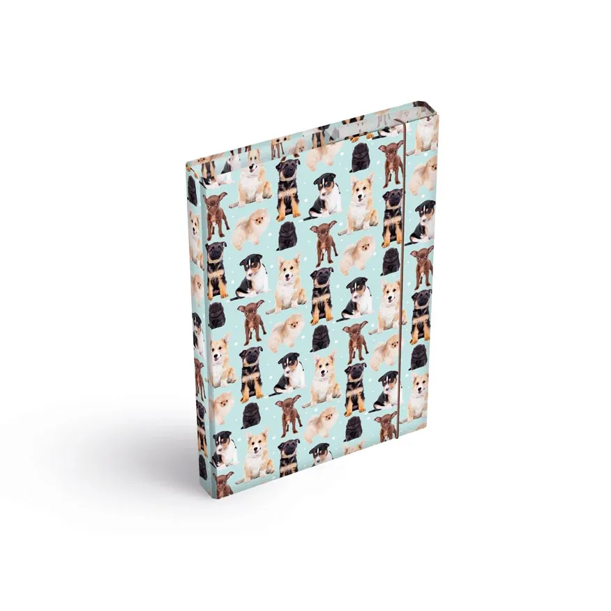 Školní desky na sešity ve velikosti A5 s motivem psů. Nezbytná součást vybavení každého školáka. Díky školním deskám budou všechny sešity a učebnice pohromadě a neponičené. Tyto desky na sešity jsou opatřeny gumou, která zabraňuje samovolnému otevření. Heft box je vyroben z kvalitního lepenkového kartonu, potaženého laminem. Z tohoto důvodu se dá velice lehce udržovat.