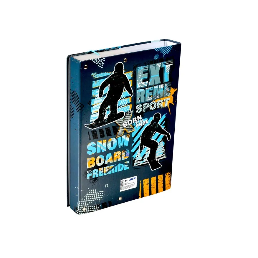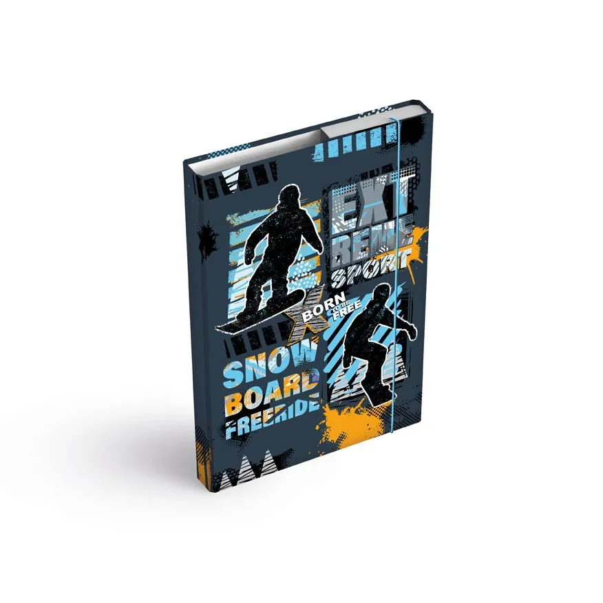 Školní desky na sešity ve velikosti A5 s motivem snowboard. Nezbytná součást vybavení každého školáka. Díky školním deskám budou všechny sešity a učebnice pohromadě a neponičené. Tyto desky na sešity jsou opatřeny gumou, která zabraňuje samovolnému otevření. Heft box je vyroben z kvalitního lepenkového kartonu, potaženého laminem. Z tohoto důvodu se dá velice lehce udržovat.