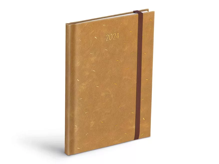 Týdenní diář pro rok 2024 ve formátu A5, v hnědé barvě, je výborným pomocníkem pro organizování Vašeho času. Diář má odtrhávatelný spodní rožek, který umožní rychlé nalistování aktuálního týdne. Uzavírání je na gumičku.