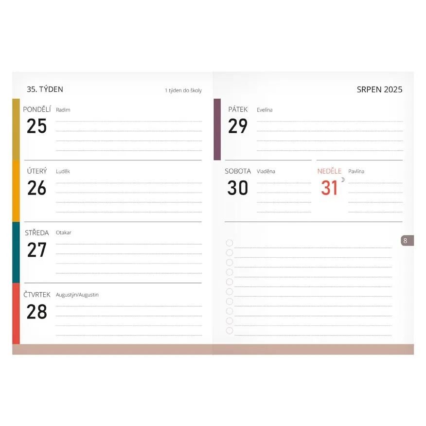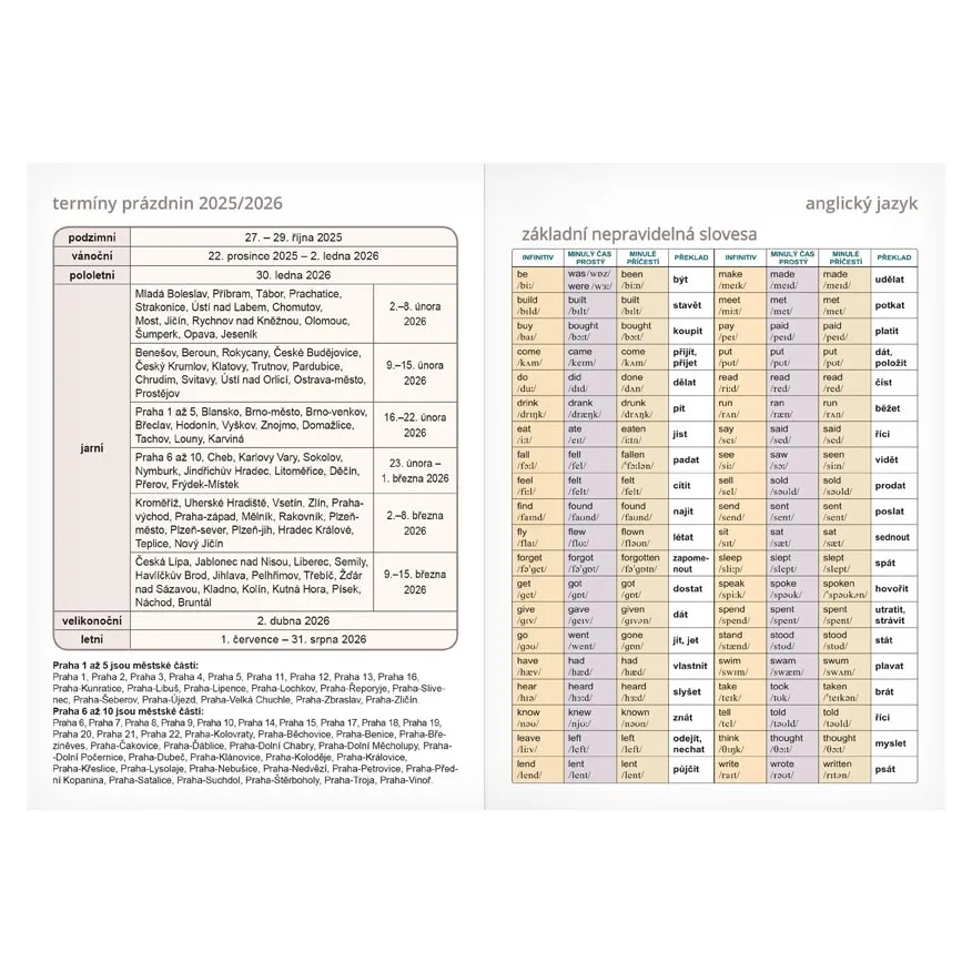 Bude vás provázet celým rokem 2025 i 2026. Laminovaný pevný obal ochrání všechny vaše nápady, zápisky a plány. Uvnitř najdete přehledné kalendárium, prostor pro poznámky, termíny i myšlenky, které zatím nechcete nikomu říct.