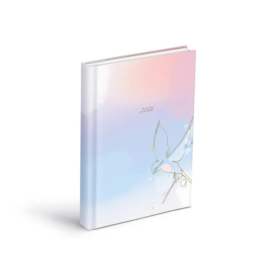 Elegantní denní diář ve formátu A5 na rok 2026 s motivem volně letícího ptáka na jemném akvarelovém pozadí přináší pocit lehkosti a svobody do každodenního plánování. Díky odtrhávacím rožkům se snadno dostanete k aktuálnímu dni, bez nutnosti listovat.