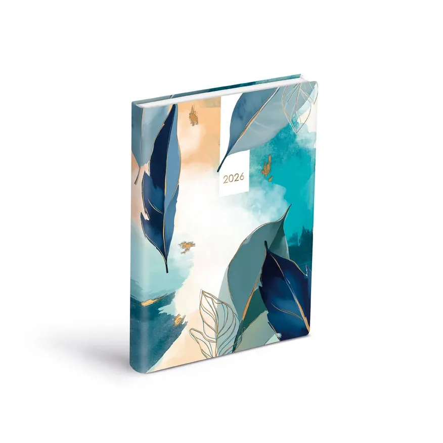 Denní diář 2026 ve formátu A5 zaujme originálním motivem listů v tónech modré, tyrkysové a béžové s jemnými zlatými akcenty. Design působí svěže, nadčasově a zároveň umělecky – ideální pro ty, kdo mají rádi čistou estetiku a přehlednost.