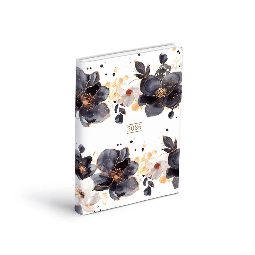 Hledáte diář, který je nejen praktický, ale i vizuálně výjimečný? Tento denní diář pro rok 2026 ve formátu A5 okouzlí výrazným květinovým motivem v hlubokých tónech černé a šedé, doplněným o jemné zlaté detaily. Moderní a přitom nadčasový design se skvěle hodí pro každodenní použití i jako elegantní doplněk na stole.