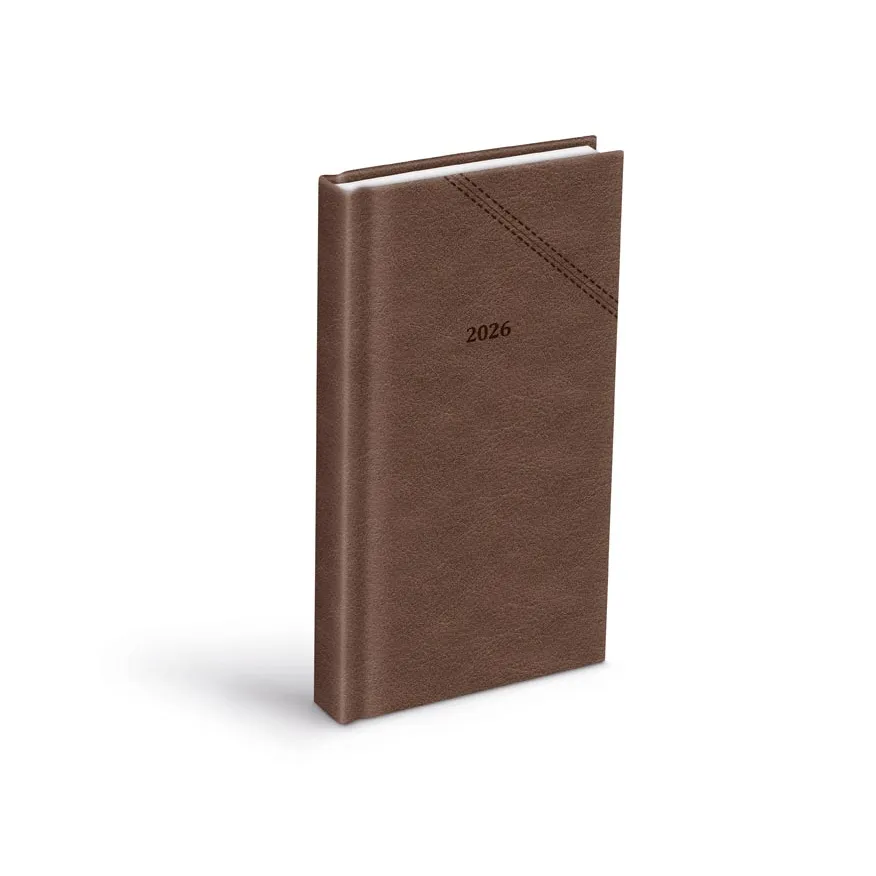 Tmavě hnědý denní diář pro rok 2026 vsází na čistý vzhled a decentní šikmé prošití, které mu dodává nenápadný šmrnc. Měkčený povrch je příjemný do ruky, praktický formát zase ideální na cesty i na pracovní stůl.