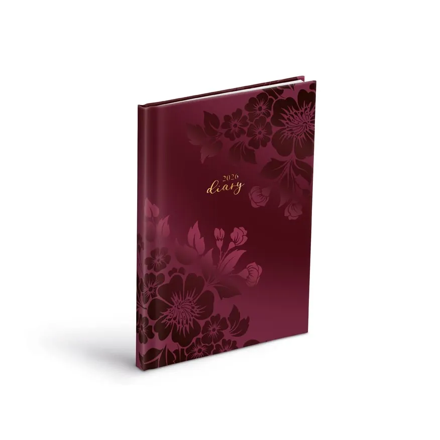Týdenní diář ve formátu A5 pro rok 2026 zaujme na první pohled – sytě vínová obálka s květinovým vzorem a matným laminem s parciálním lakem vytváří elegantní kombinaci matného povrchu a lesklých detailů, které působí luxusně a zároveň decentně.