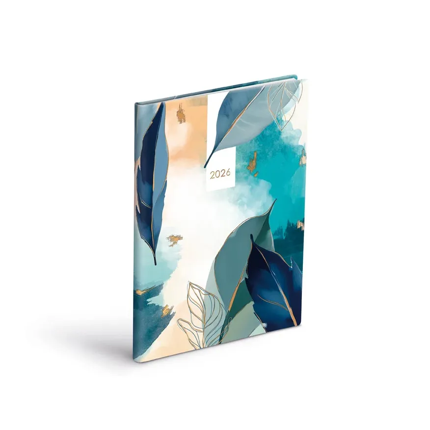 Tento týdenní diář na rok 2026 ve formátu A5 přináší do plánování harmonii i styl. Design inspirovaný přírodou, s motivem stylizovaných listů, kombinuje tlumené tóny modré, tyrkysové a béžové s jemnými zlatými liniemi, které celku dodávají moderní, klidný charakter.