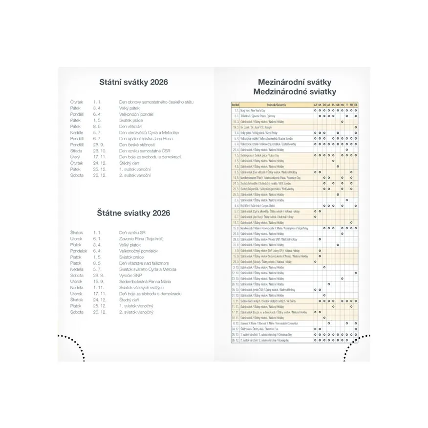 Obálka je opatřena matným laminem s parciálním lakem, který dodává celku elegantní vzhled, zvýrazňuje vybrané prvky a zajišťuje odolnost vůči každodennímu používání. Díky kompaktním rozměrům se diář snadno vejde do kabelky, batohu i pracovní tašky – můžete ho tak mít vždy po ruce. Praktické odtrhávací rožky pomáhají udržet přehled – snadno vás navedou na aktuální týden bez zbytečného hledání.