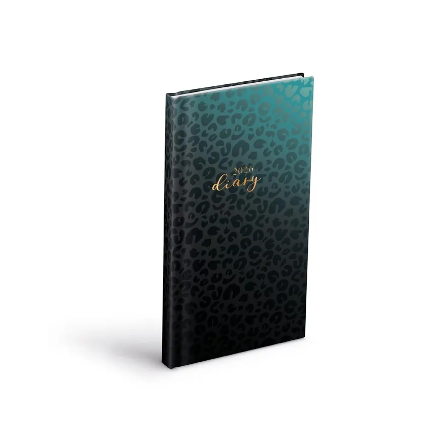 Týdenní diář 2026 zaujme tmavým přechodem barev od smaragdové po černou, doplněným o jemný leopardí vzor. Tento moderní design s nádechem zvířecího motivu je elegantní, ale zároveň odvážný – ideální pro ty, kteří mají rádi výrazný styl.