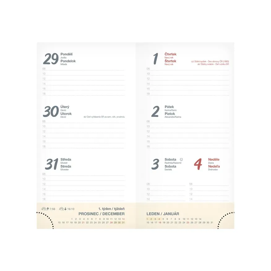 Obálka je vyrobena z matného lamina s parciálním lakem, což zvýrazňuje detaily vzoru a dává diáři jedinečný kontrast mezi matným a lesklým povrchem. Diář je tak nejen vizuálně atraktivní, ale i odolný pro každodenní používání. Odtrhávací rožky vám usnadní orientaci v diáři – díky nim snadno přejdete na aktuální týden a ušetříte čas při hledání.