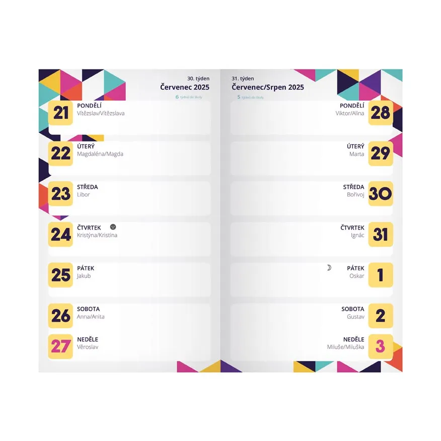 Diář je odolný díky laminovaným deskám, které vydrží každý den – od školní tašky po zápisky na hodinách. Je malý, ale šikovný – nabízí dostatek místa pro všechny úkoly, termíny a nápady. Ideální pro školáky, kteří mají rádi pořádek, ale nechtějí se vzdát trošky stylu.
