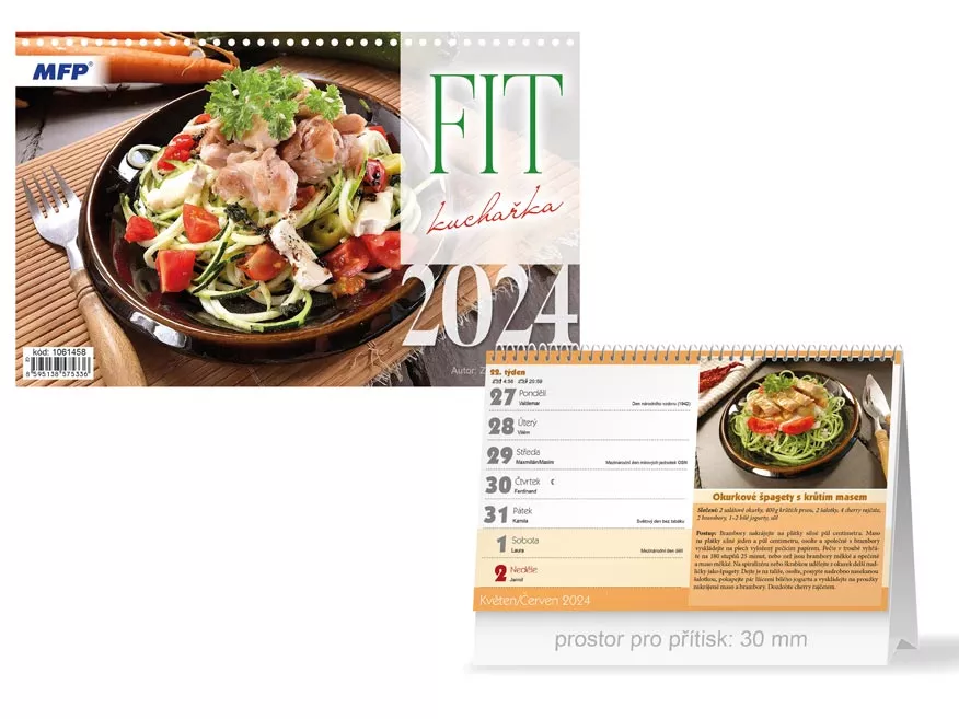 MFP kalendář 2024 stolní FIT kuchařka 1061458. Stolní kalendář na rok 2024 s názvem FIT kuchařka. Každý týden Vás potěší jeden recept na chutný pokrm.Vhodný na zapisování důležitých poznámek, k organizování různých událostí každodenního života. Možnost dotisku firemního loga a textu na spodní stranu ...