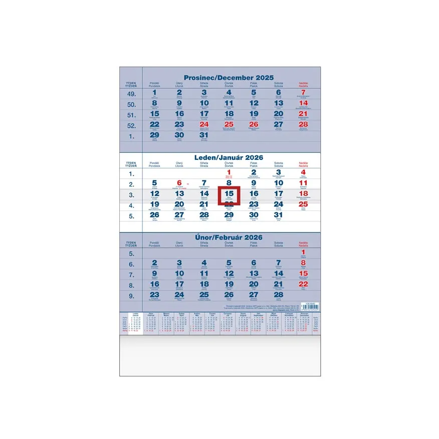 Nástěnný kalendář na rok 2026. V tomto kalendáři jsou zobrazeny tři měsíce na jednom listu. Vhodný k organizování různých událostí každodenního života. Možnost dotisku firemního loga a textu na spodní stranu kalendáře.