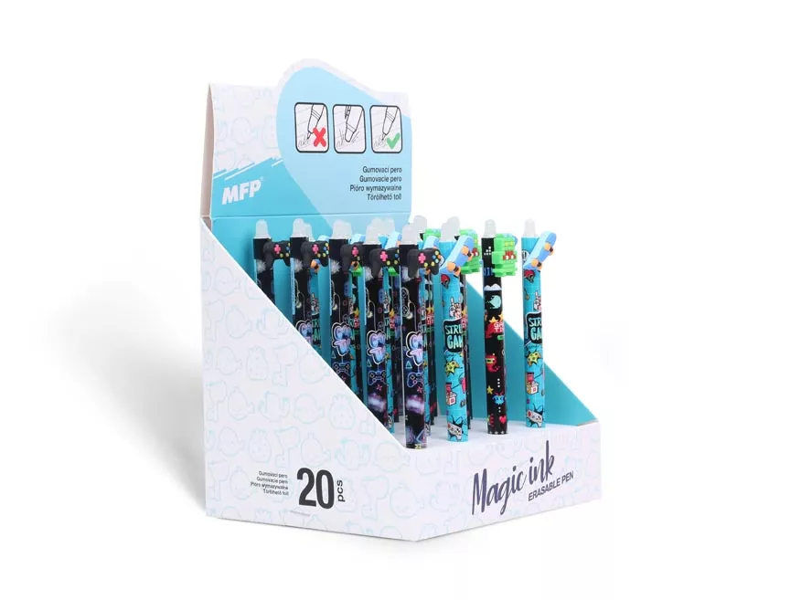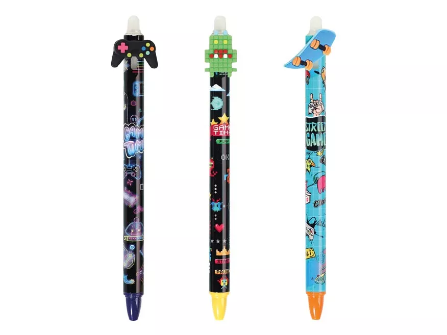Gumovací gelové kuličkové pero s motivem skateboardu, gamepadu obsahuje speciální inkoust tzv. vymaž a přepiš, nebo vymaž a nech znovu objevit. Pokud uděláte chybu, stačí jen otočit pero a plastovou špičkou text vymažete. Špička zahřeje inkoust, ten zmizí a lze je znovu přepsat. Můžete si psát i tajné vzkazy, po vygumování stačí jen papír ochladit pod bod mrazu a text se znovu objeví. Tato vymazatelná propiska je balena v papírovém stojanu po 20 ks.