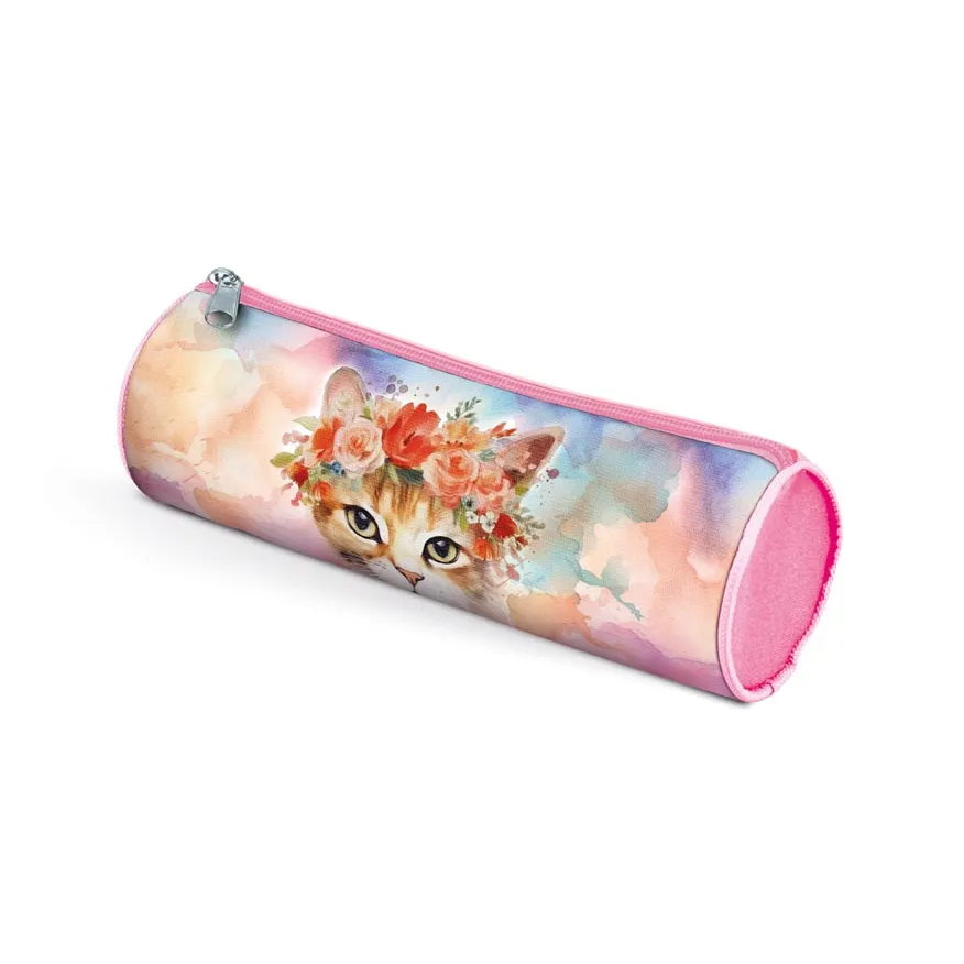 Tato roztomilá etue s motivem kočičky s květinovou korunou na pastelovém pozadí zaujme na první pohled a rozjasní každou školní lavici. Její praktický válcový tvar poskytuje dostatek prostoru pro všechny vaše psací potřeby, zatímco růžové detaily a zip dodávají celku hravý a stylový vzhled.