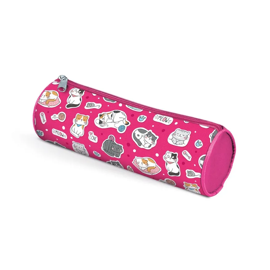 Školní penál/etue v sytě růžové barvě s motivem koček. Penál má jednu komoru s uzavíráním na zip. Uvnitř je dostatek prostoru na všechny psací potřeby, co školák potřebuje. Vhodný především na pastelky, fixy a další psací potřeby. Etue je vyrobena z kvalitních a odolných materiálů.